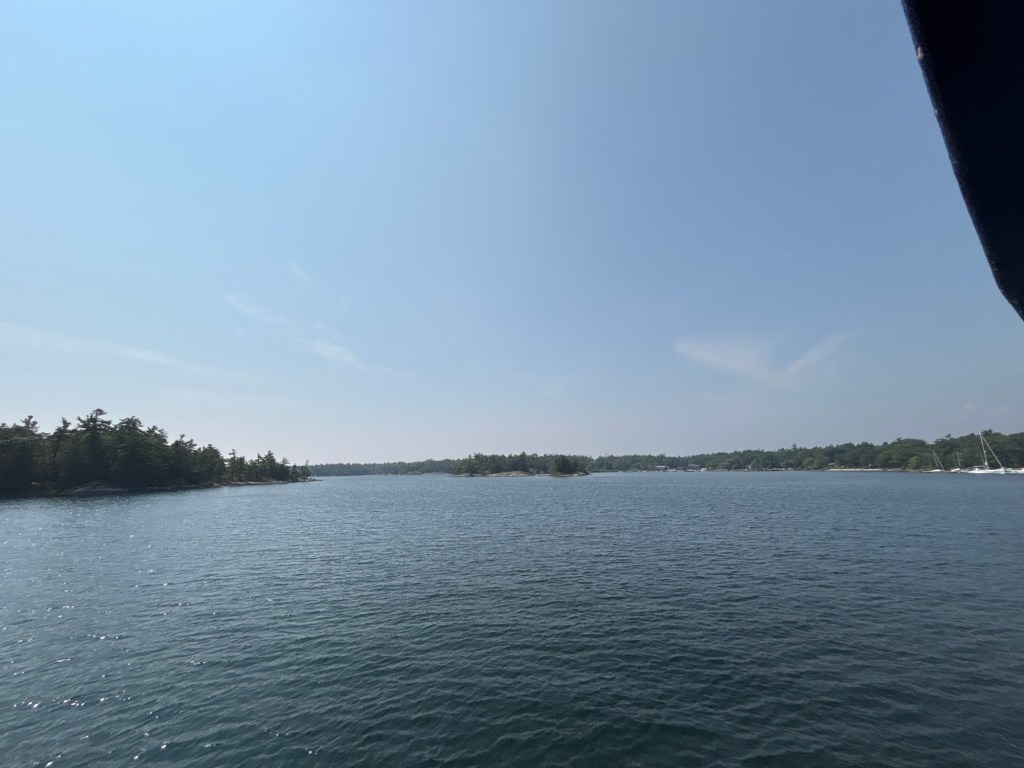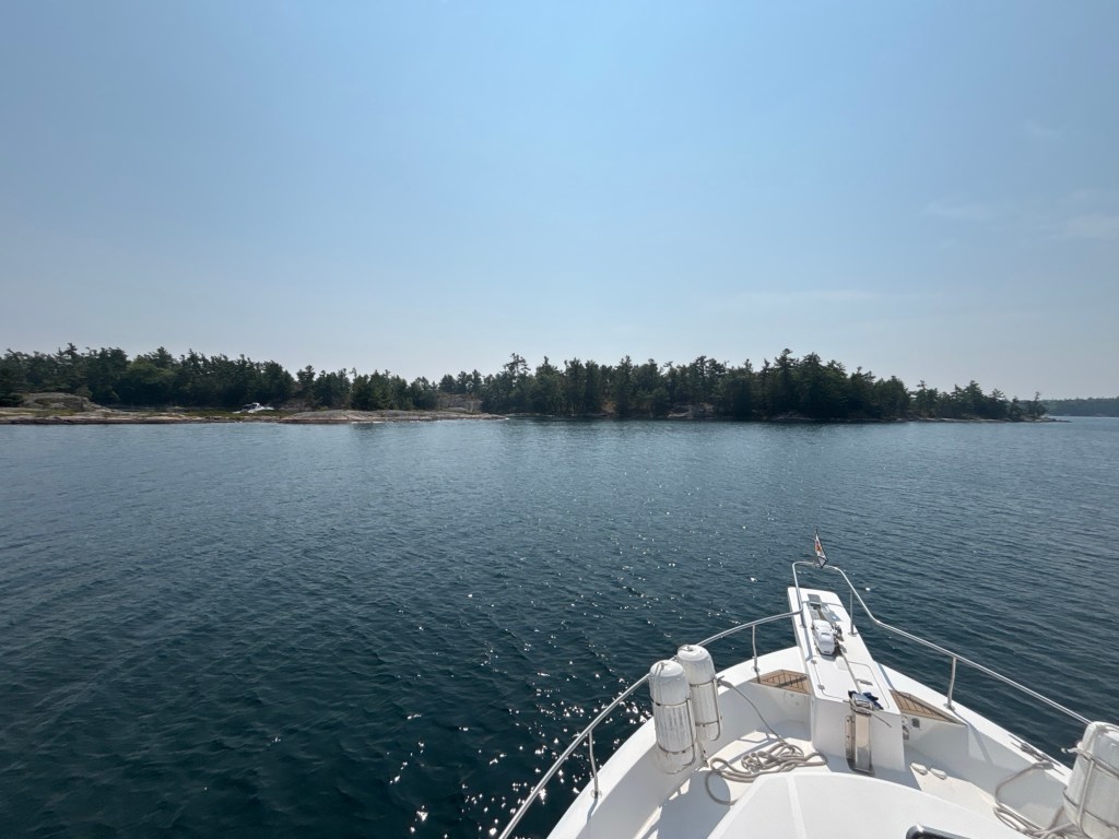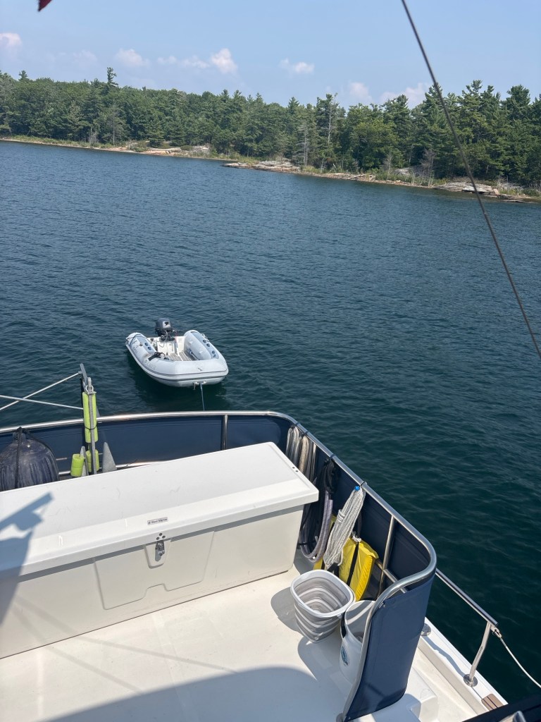 Left Wye Heritage Marina heading for Frying Pan Bay anchorage for our first night in the Georgian Bay. Way too crowded for our liking so we continued up the channel to check out other anchorages. Stopped at a few looking for maybe a sandy beach, but no the whole Bay is rock. Pull into Big Daddy Bay and tuck up in the corner of it is Kings Bay, must be my kind of place. Beautiful little protected bay perfect for us. Put the dinghy in the water and livin the dream.