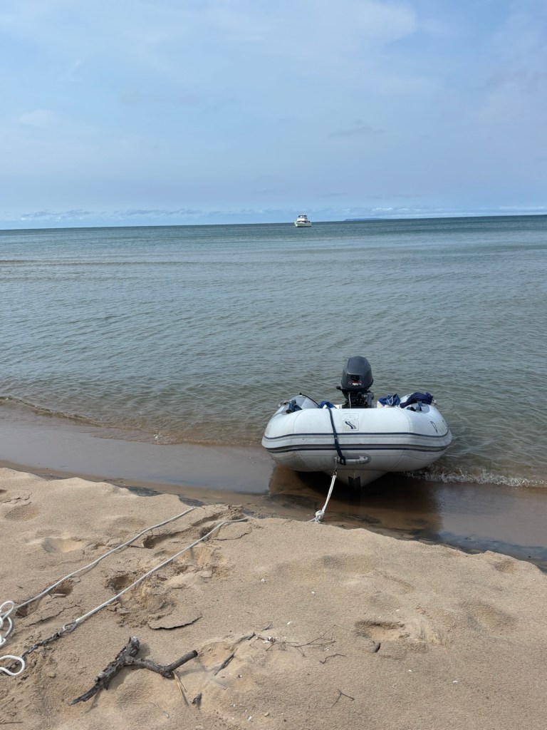 Bailed again and anchored at Platte Bay, Sleeping Bear Dunes. No fun at all. We took the dinghy to the beach and walk the shoreline.