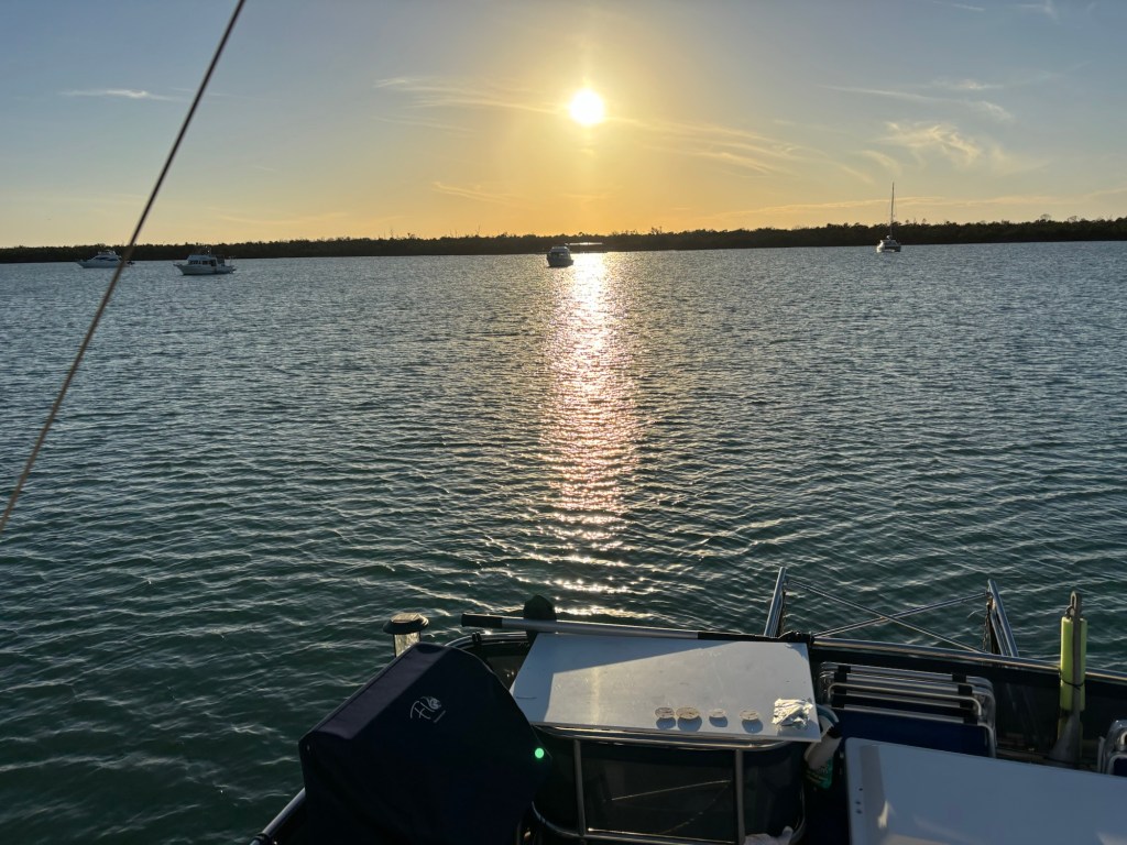 Beautiful sunset and the Admiral made a great dinner and we had a nice evening at anchor. Tomorrow on to Captiva, T’ween Water Marina.