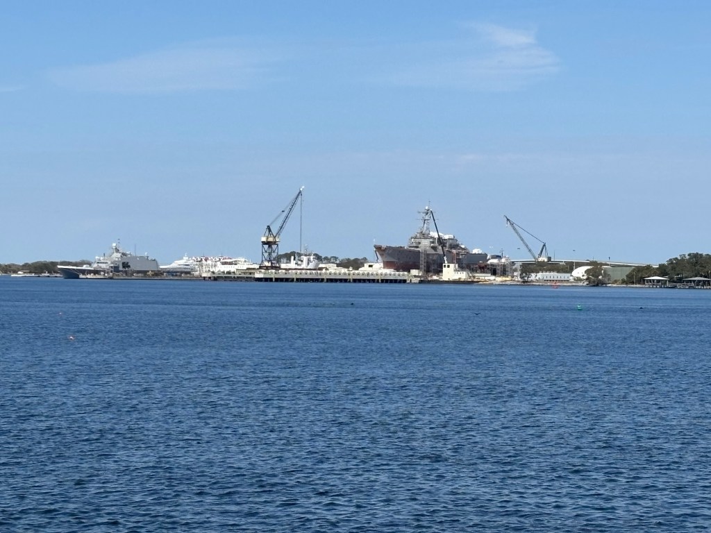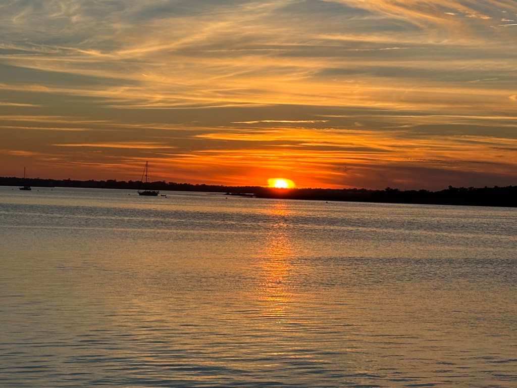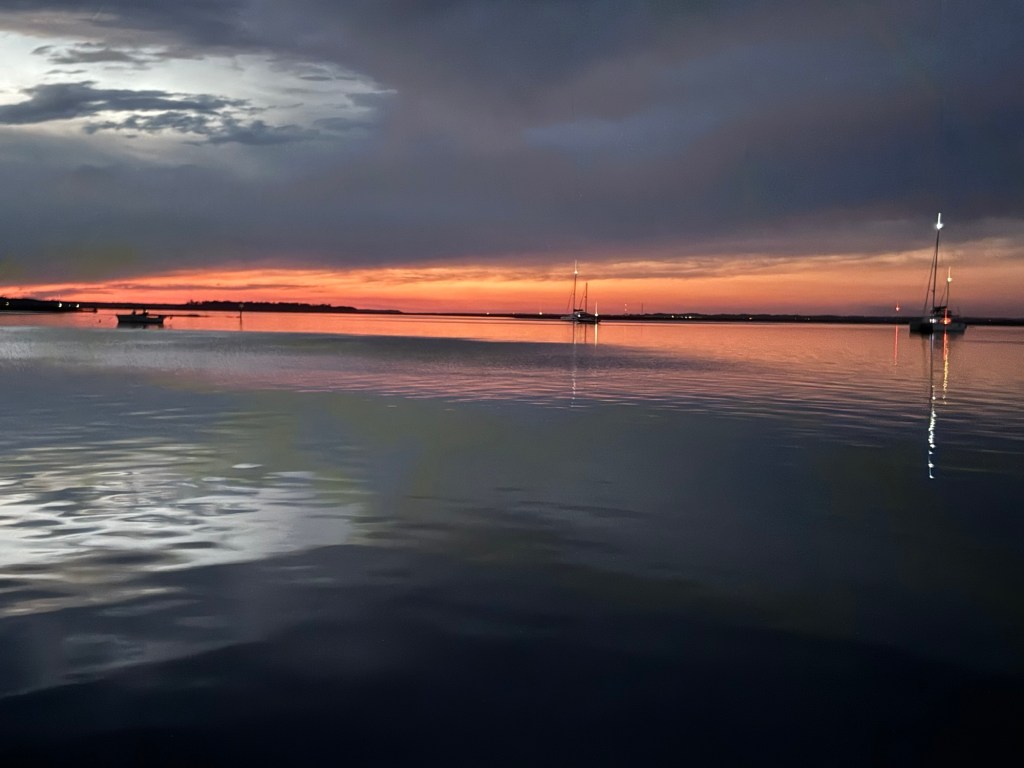 I ordered a Gold Burgee to replace the white one which was to be sent to the marina, but USPS said they didn’t delivery to the marina!! My luck, so no pictures of us with the Gold. Just a beautiful sunset!
